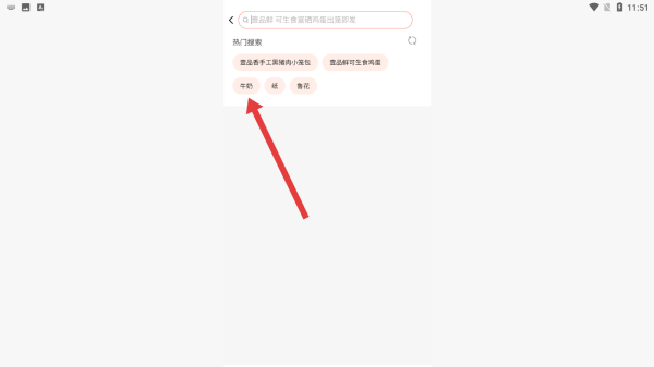 2、在搜索界面点击热门搜索标签如牛奶,可以快速获取对应商品的搜索结果。