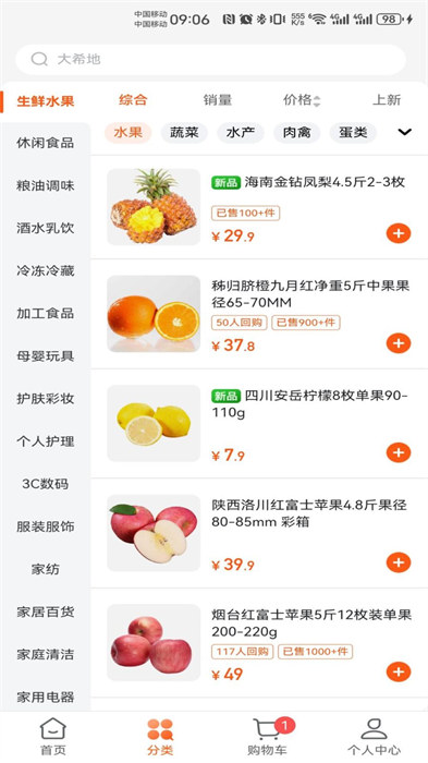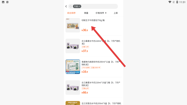 3、查看搜索结果页的商品列表,浏览牛奶等商品的价格与详情,点击购买心仪商品。