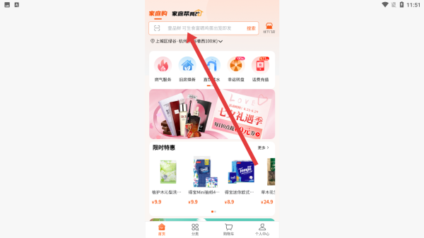 1、点击壹品慧首页顶部搜索框,准备输入关键词,开启使用搜索商品流程。