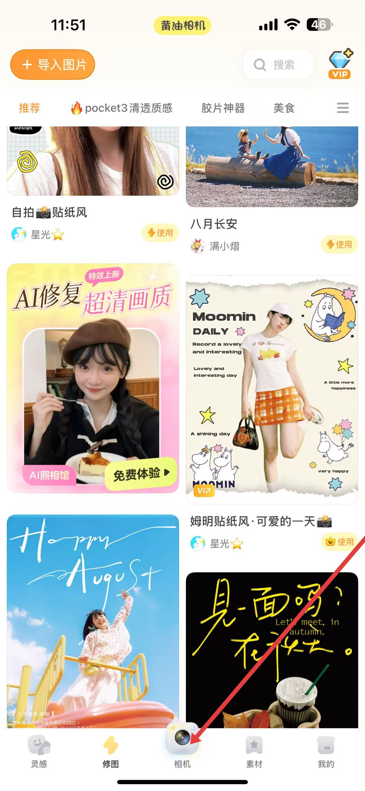 1、打开黄油相机,点击底部导航栏中的相机图标进入拍摄界面。