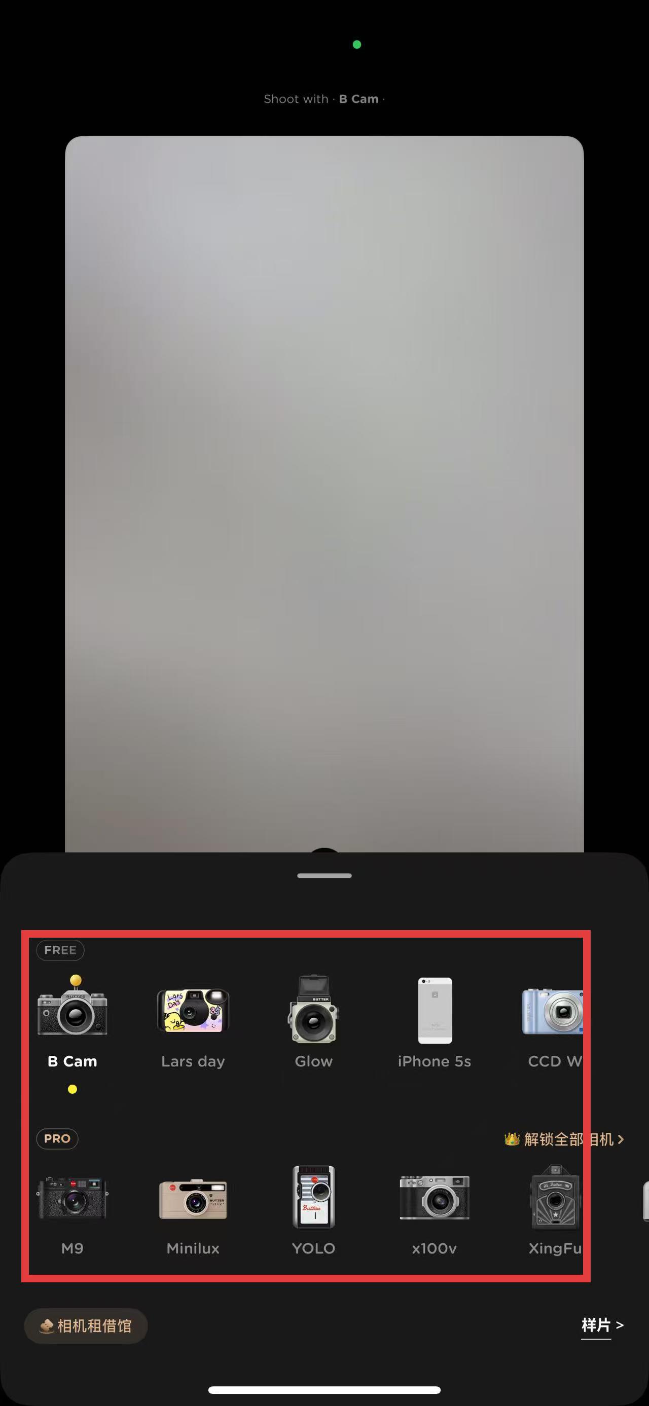 2、在拍摄界面下方,选择喜欢的相机风格,比如B Cam、Lars day、Glow 等免费或PRO相机风格。