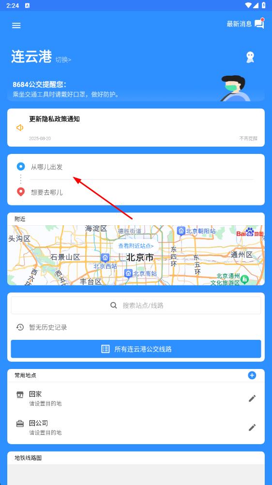 2、选定城市后,跳转至主界面,找到“从哪儿出发”输入框,录入出行起点信息 。