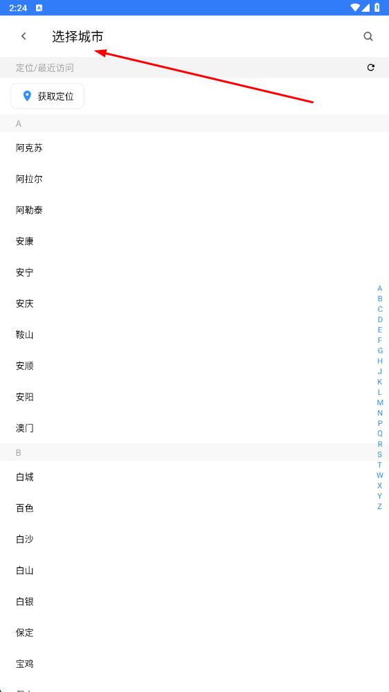 1、打开公交查询软件,进入“选择城市”页面,可手动挑选目标城市,也点击“获取定位”自动匹配所在城市 。