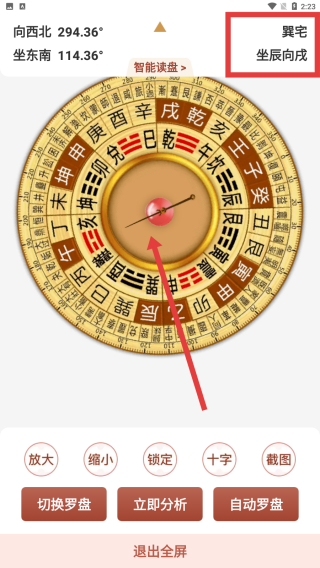 1、在智能罗盘界面中,按照箭头指示点击全屏,进入全屏模式。
