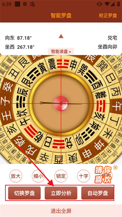 2、随后,进入到首页可看到大型罗盘,并点击最下方分析,了解具体的信息资讯;