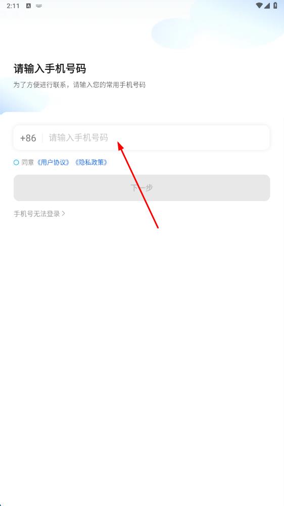 2、在“请输入手机号码”界面,于指定输入框录入常用手机号码,勾选同意用户协议,隐私政策。