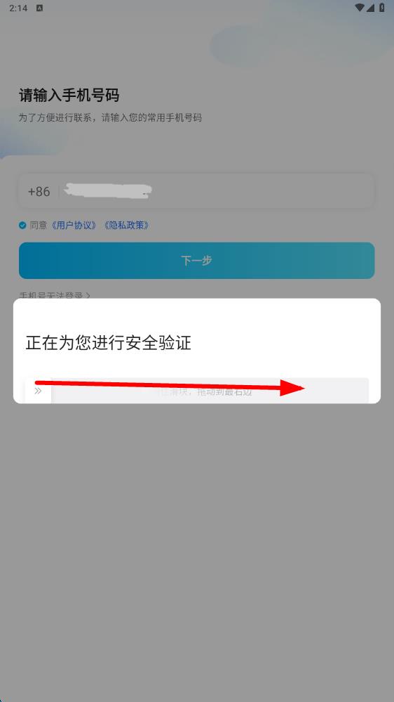 3、点击“下一步”,弹出“正在为您进行安全验证”提示,拖动验证滑块完成安全验证,推进注册流程。