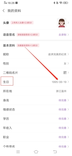 3、在我的资料中,找到“生日”,点击右侧的具体日期;