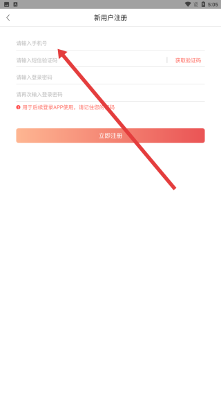 3、在新用户注册页面,点击请输入手机号输入框,填写本人常用手机号码,完成注册第一步信息录入。
