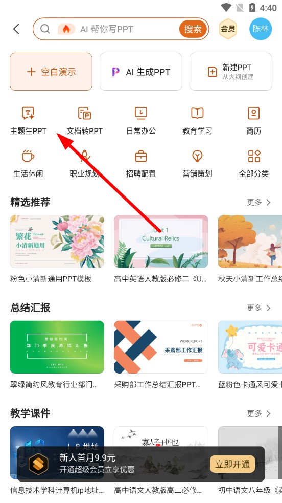 2、进入新页面后,点击主题生成PPT,找到AI生成PPT功能入口。