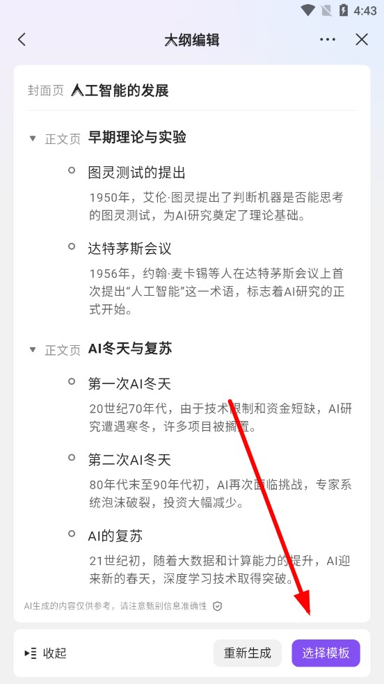 4、AI生成大纲后,点击选择模板,完成PPT制作。