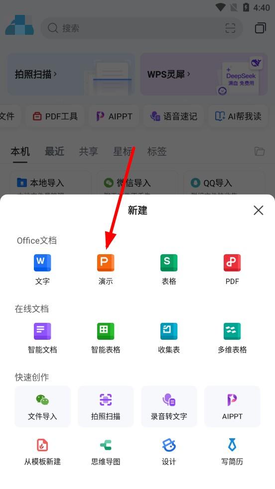 1、打开WPS Office,点击演示,进入PPT创建流程。