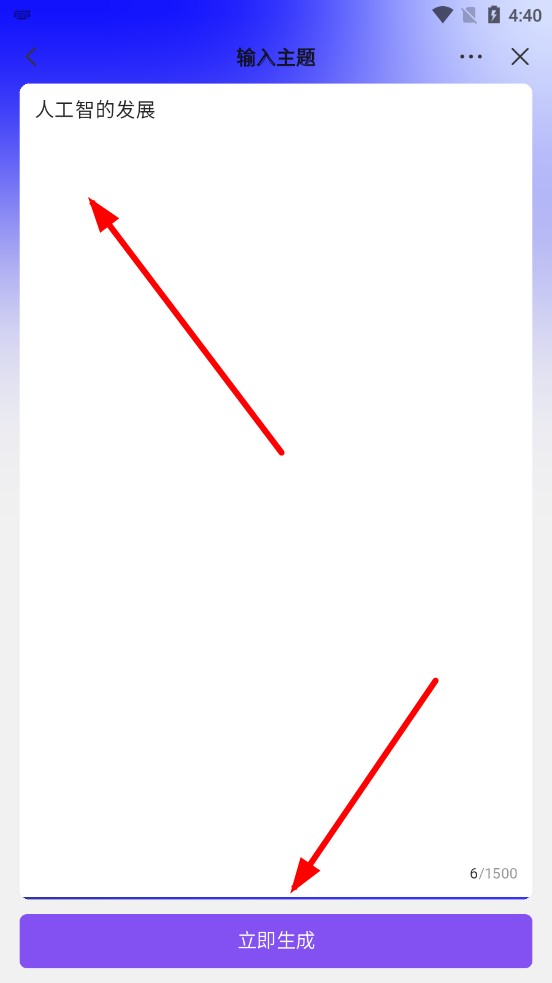 3、在输入主题界面,填写PPT主题,点击立即生成,等待AI产出PPT大纲内容。