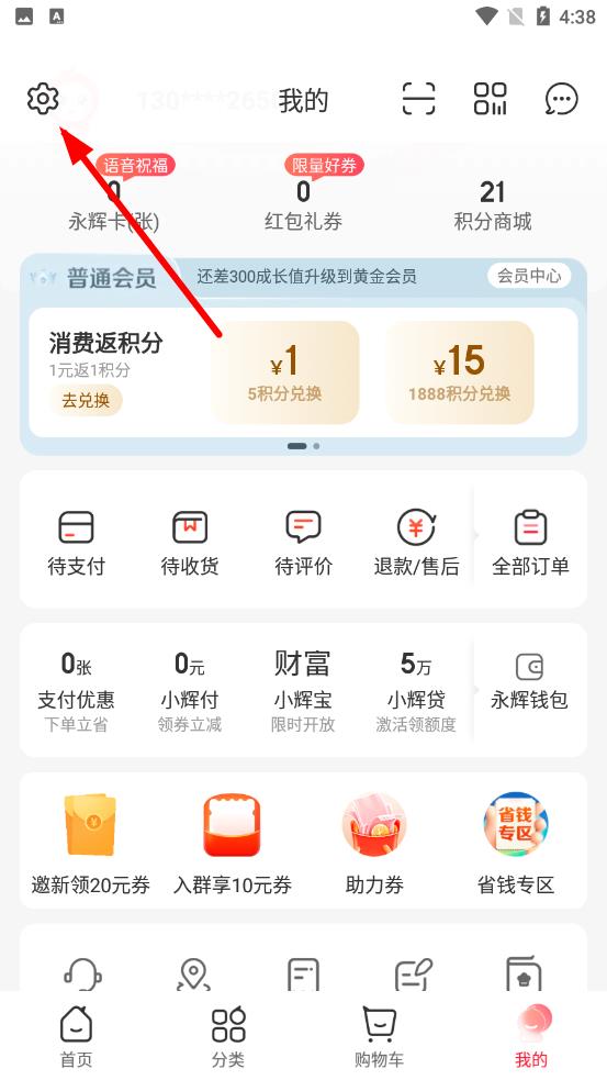 1、打开永辉生活app,点击底部导航栏中的我的选项,进入个人页面,然后点击页面左上角的设置图标,进入设置界面。