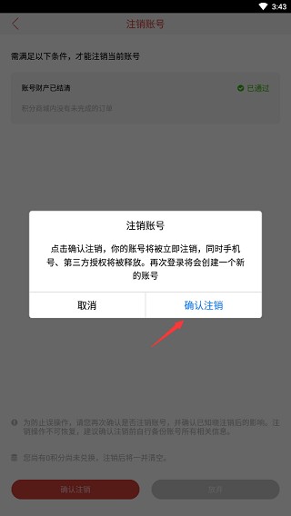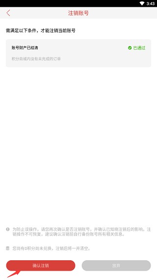 5、注销账号:等待条件满足通过,点击“确认注销”