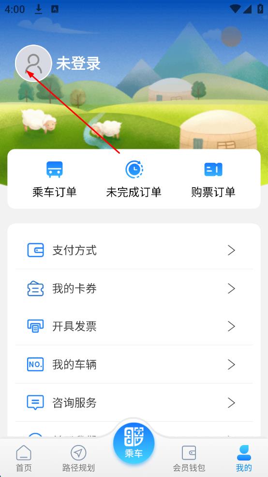 1、打开青城地铁应用,进入“我的”页面,点击上方“未登录”头像区域,跳转至登录界面 。