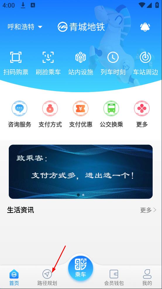 3、登录后返回主界面,点击底部“路径规划”选项,进入路径规划页面,可查询地铁乘车路线 。