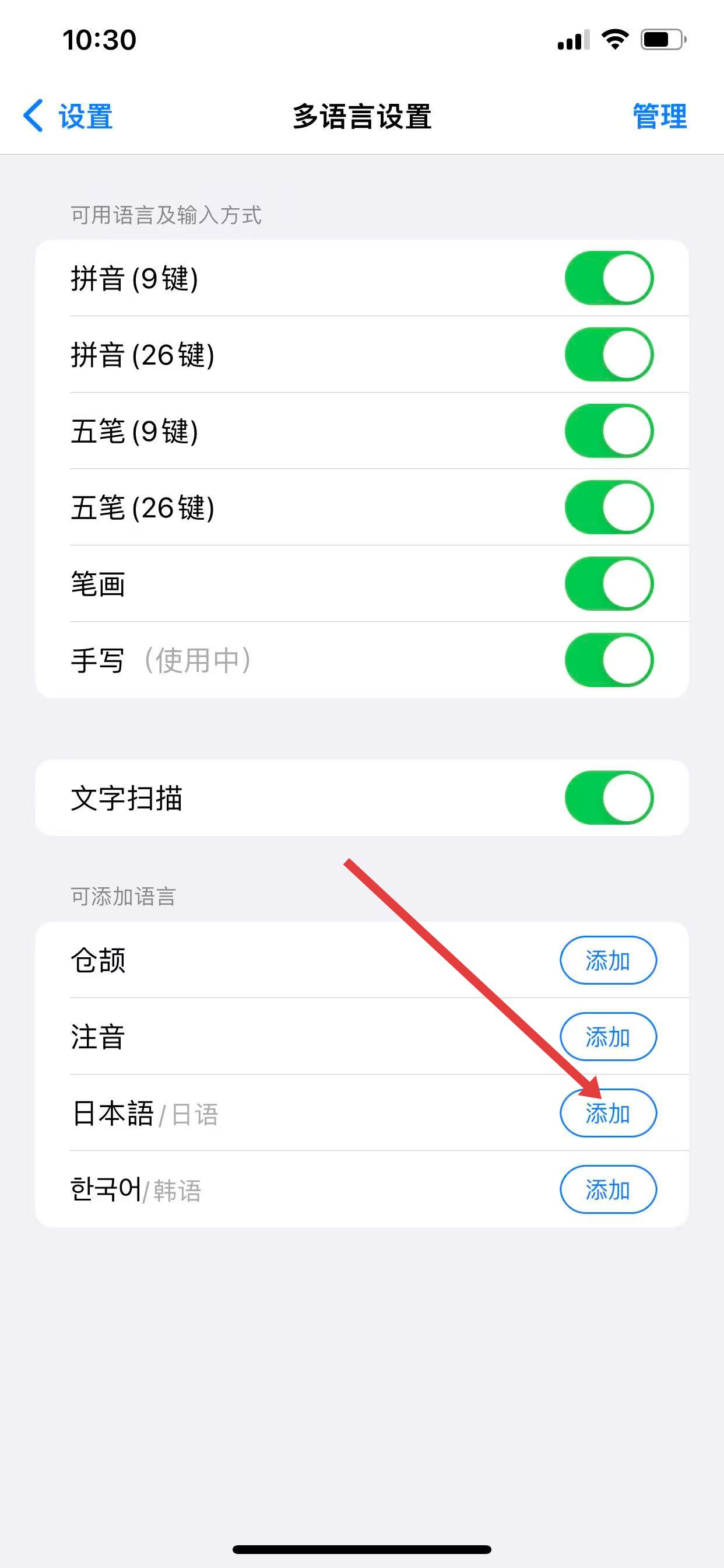 2、在多语言设置界面,找到日本語/日语,点击右侧添加按钮。