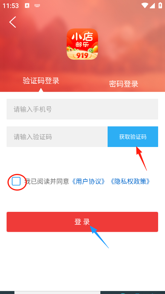 5、输入手机号,点击“获取验证码”,可以点击“我已阅读...”,最后点击“登录”。
