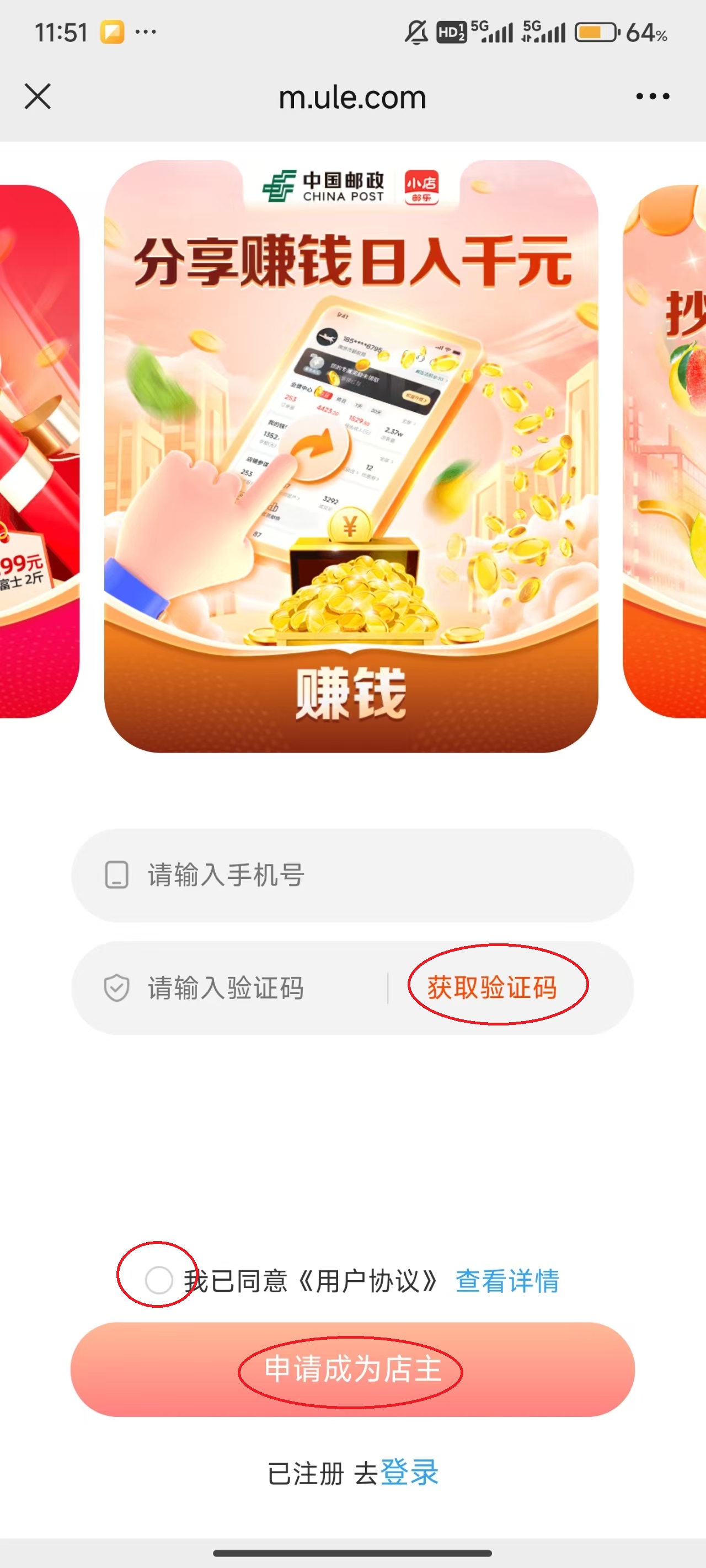 3、随后进入注册页面,输入需要注册的手机号,点击“获取验证码”,可以点击“我已同意...”,最后点击“申请成为店主”,这就是注册账号的过程了。