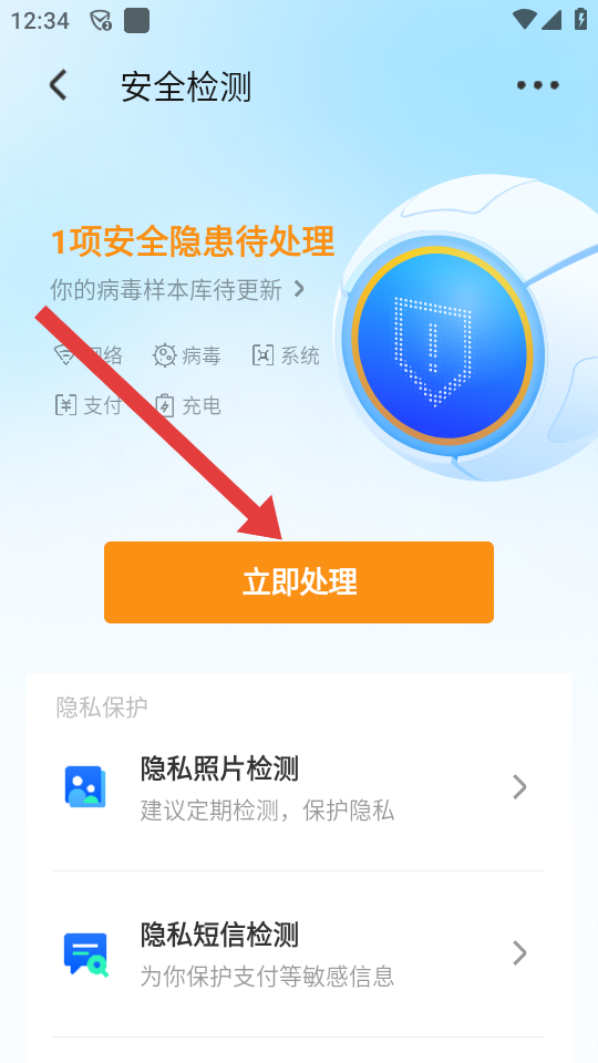 3、检测完成后,若显示安全隐患待处理,点击立即处理的按钮,即可清理病毒及安全隐患。
