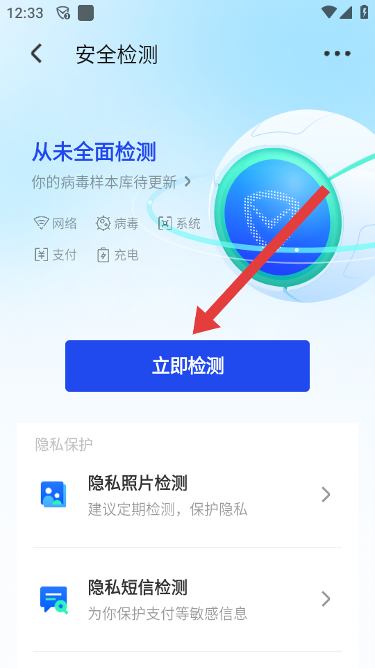 2、在安全检测的页面,需要点击立即检测的按钮,开始启动全面病毒的扫描。