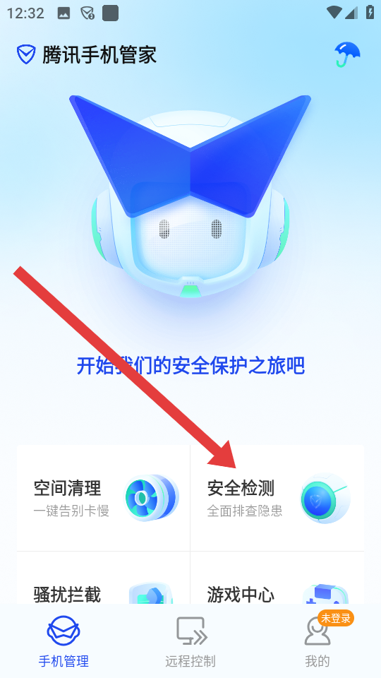 1、打开腾讯手机管家APP,进入手机管理页面,点击安全检测选项,进入安全检测界面。