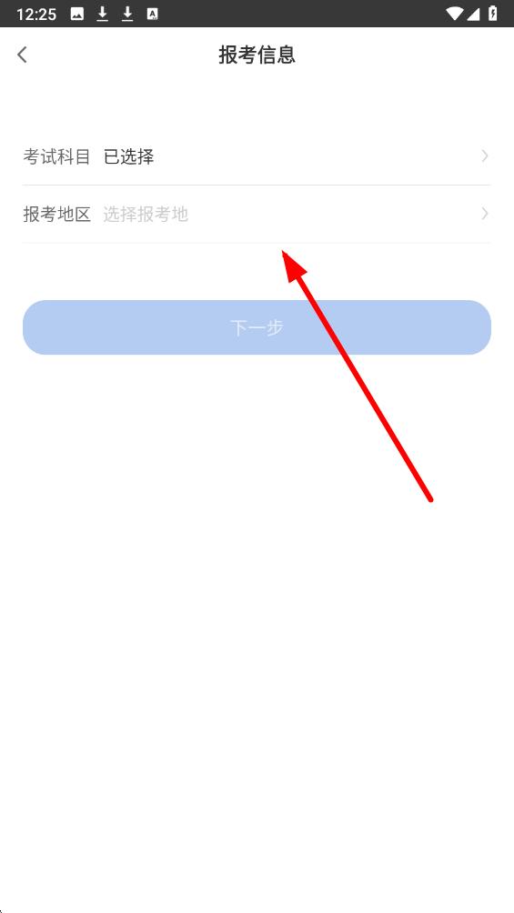3、需要完善报考信息,在相关页面点击报考地区选项,选择对应的报考地区,确认后进入app首页。