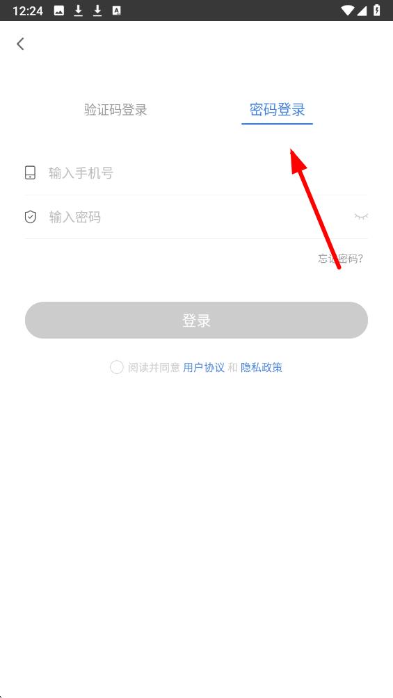2、若需使用密码登录,点击登录界面上方的密码登录选项,在输入手机号栏输入手机号,输入密码栏输入对应的密码,点击登录即可完成登录操作。