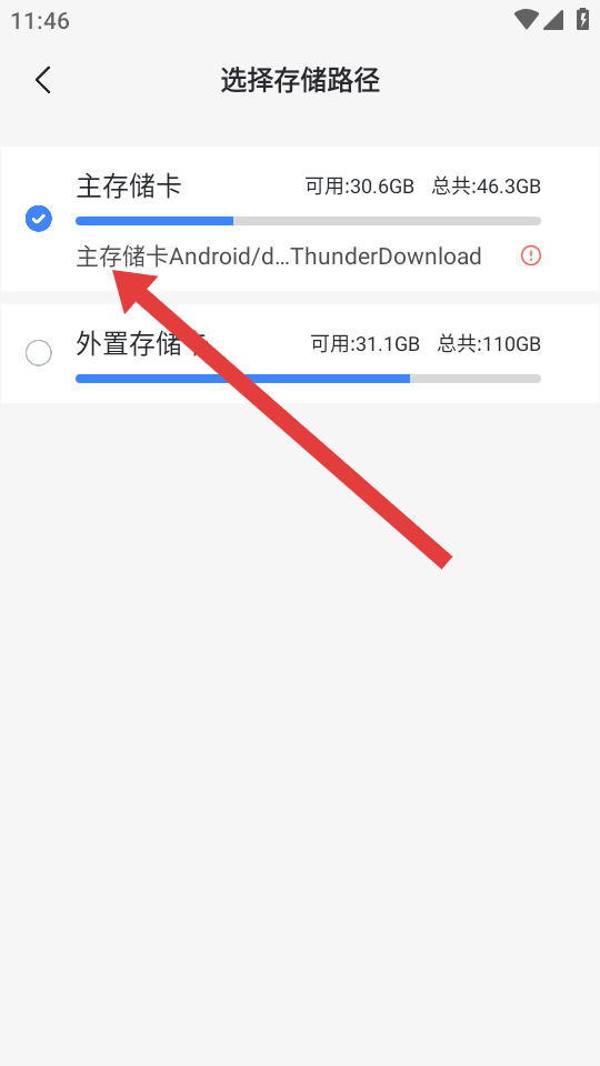 3、在选择存储路径页面,勾选主存储卡或外置存储,根据自己的需求选择,即可修改下载文件的存储路径。