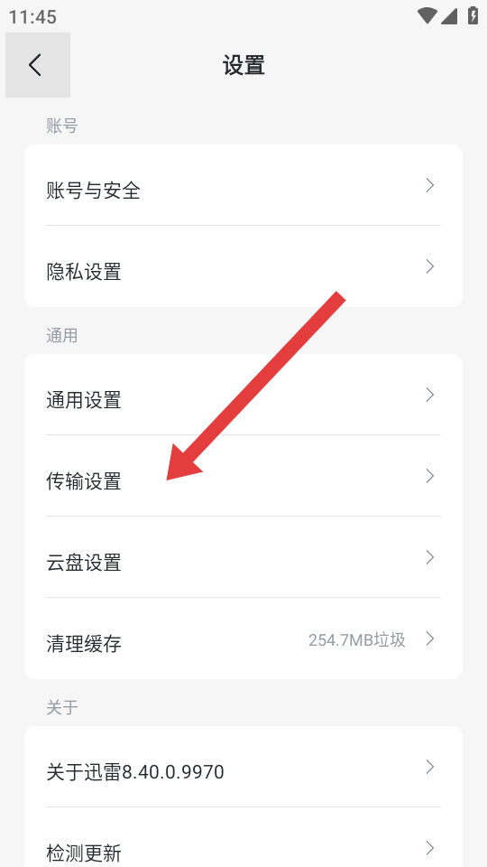 1、打开迅雷APP,进入设置的页面,点击传输设置的选项,进入传输设置界面。