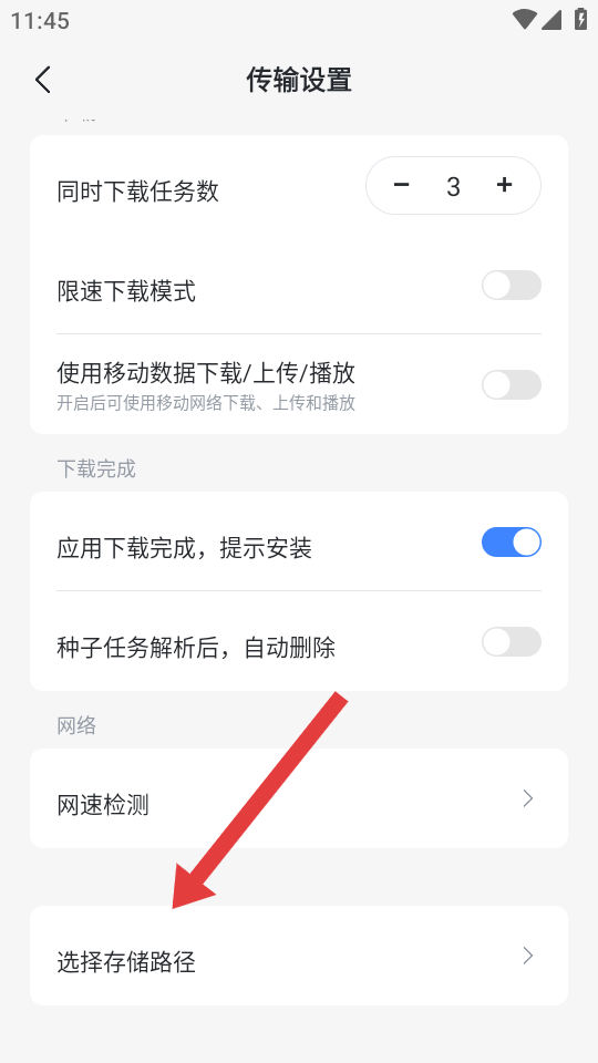 2、在传输设置页面中,点击选择存储路径的选项,跳转至存储路径选择页面。