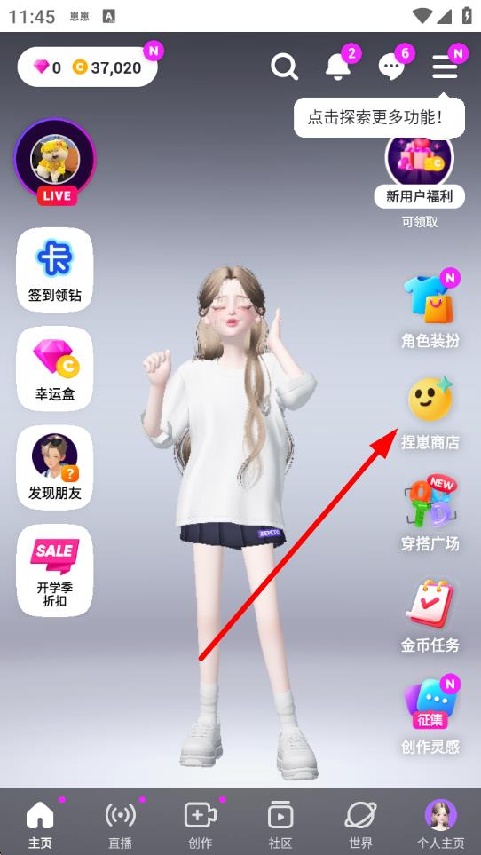 1、打开崽崽zepeto应用进入主界面,点击右侧的捏崽商店图标。