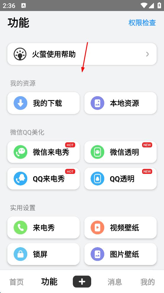 3、在功能页面,可看到火萤使用帮助、我的资源、微信QQ美化等板块,按需点击对应功能入口,开展操作 。