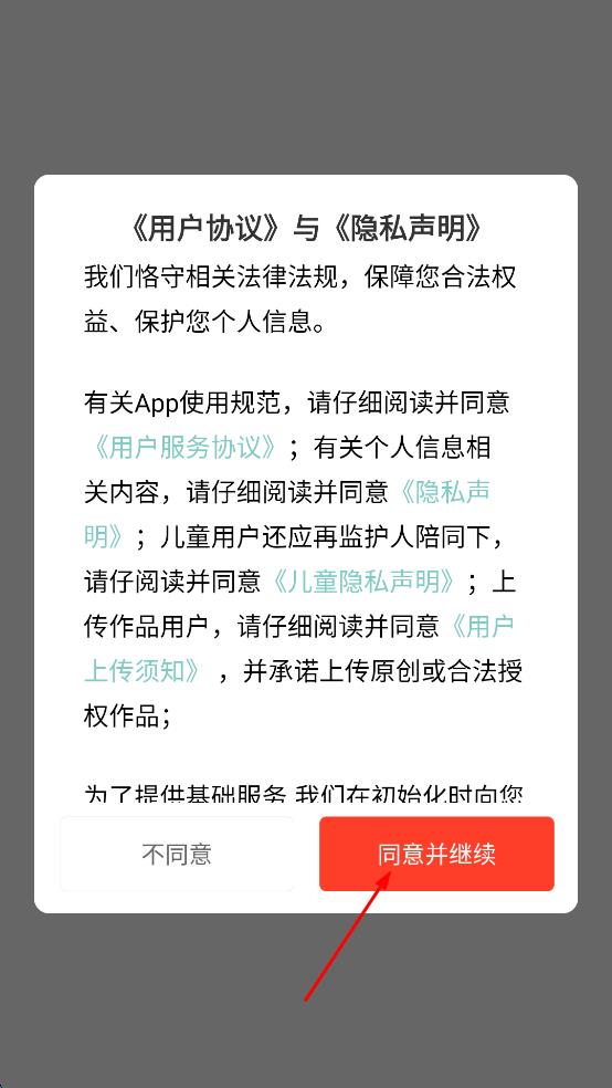 1、首次打开火萤App,弹出用户协议与隐私声明界面,阅读相关内容后点击同意并继续,完成协议确认。