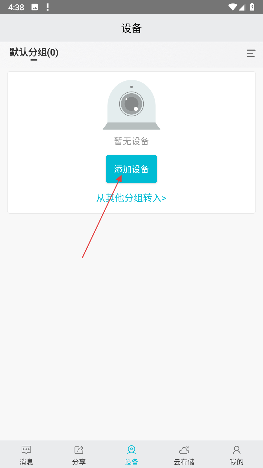 1、打开Aview应用进入设备界面,默认分组显示暂无设备,点击添加设备按钮,跳转至扫描二维码页面。