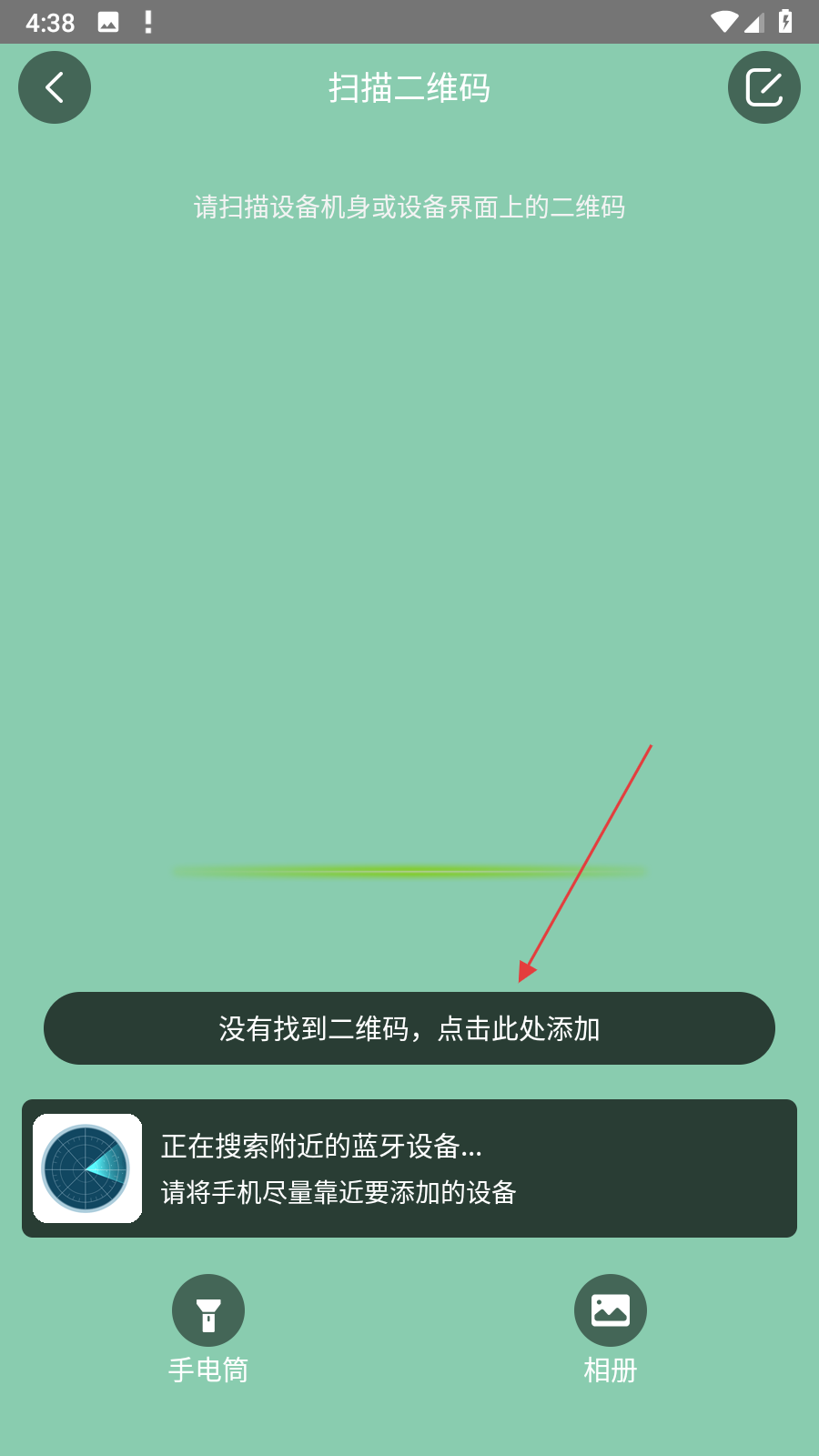 3、若未扫描到二维码,点击没有找到二维码,点击此处添加,按指引手动输入设备信息完成添加。