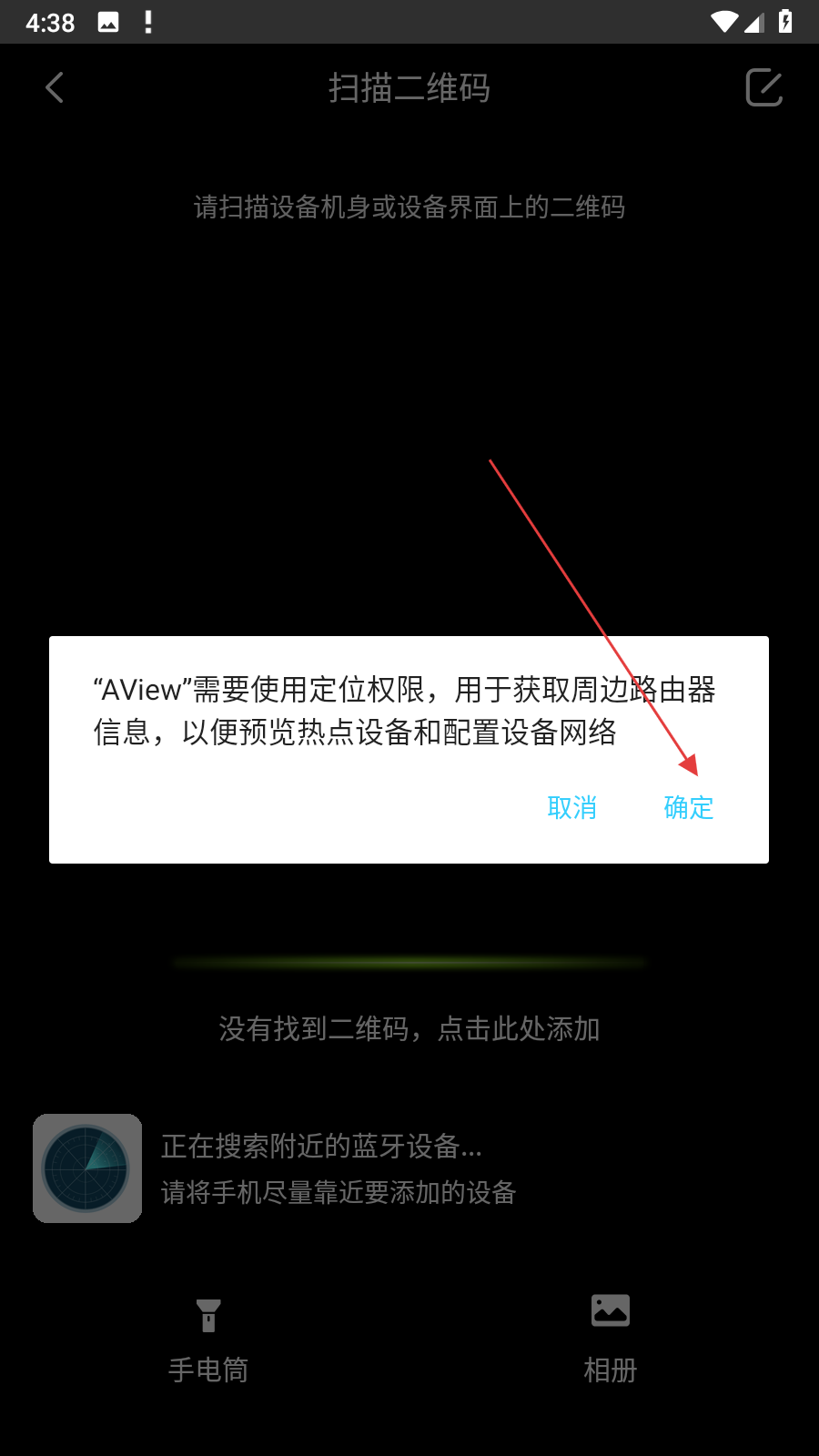2、在扫描二维码页面,若弹出定位权限申请提示,点确定,允许获取周边路由器信息,便于搜索设备。