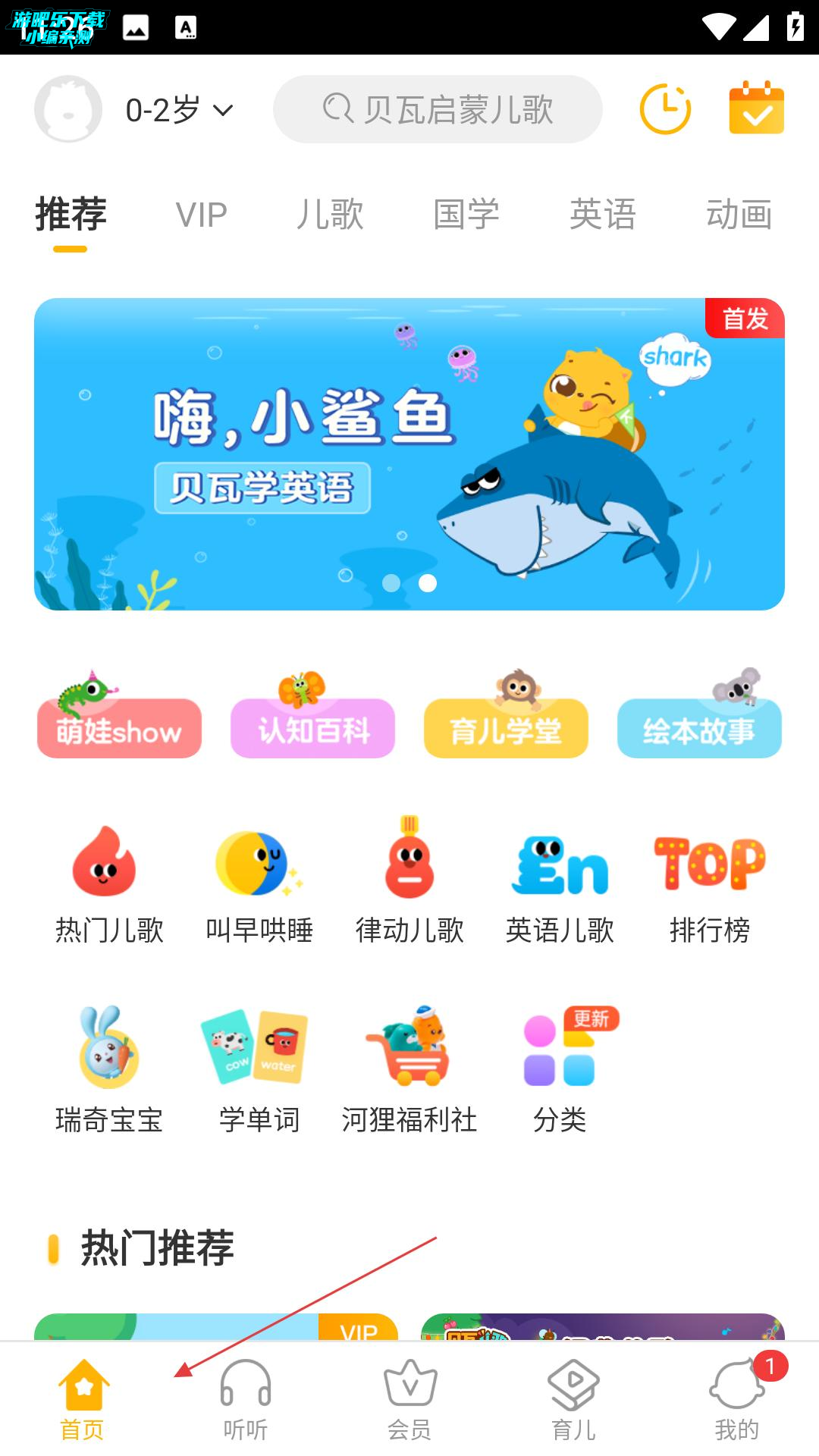 3、进入首页,有推荐、VIP、儿歌等频道,展示嗨,小鲨鱼等内容,还有萌娃show、认知百科等功能入口,及热门推荐板块。