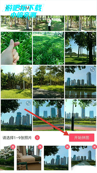 2、然后就进入到自己的相册,一次性最高可以选择9张照片,可以少,但不可以多,选择好后,点击“开始拼图”