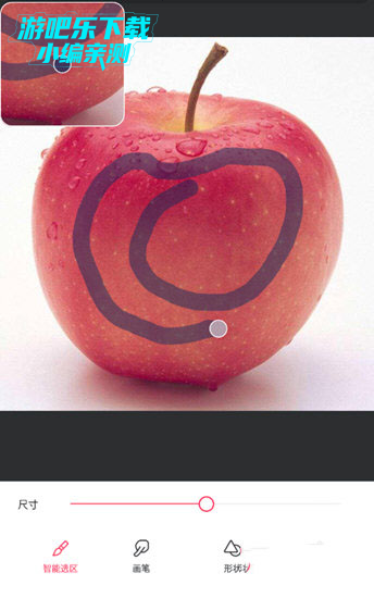3、如果你的图片背景颜色为统一的色调,那么推荐采用【智能选区】模式,然后再用手指在要抠的物品上拖动选择抠图范围,系统自动用红色的背景来表示。如果不满意,则使用【橡皮】功能来抹除不想要被抠出的部分。