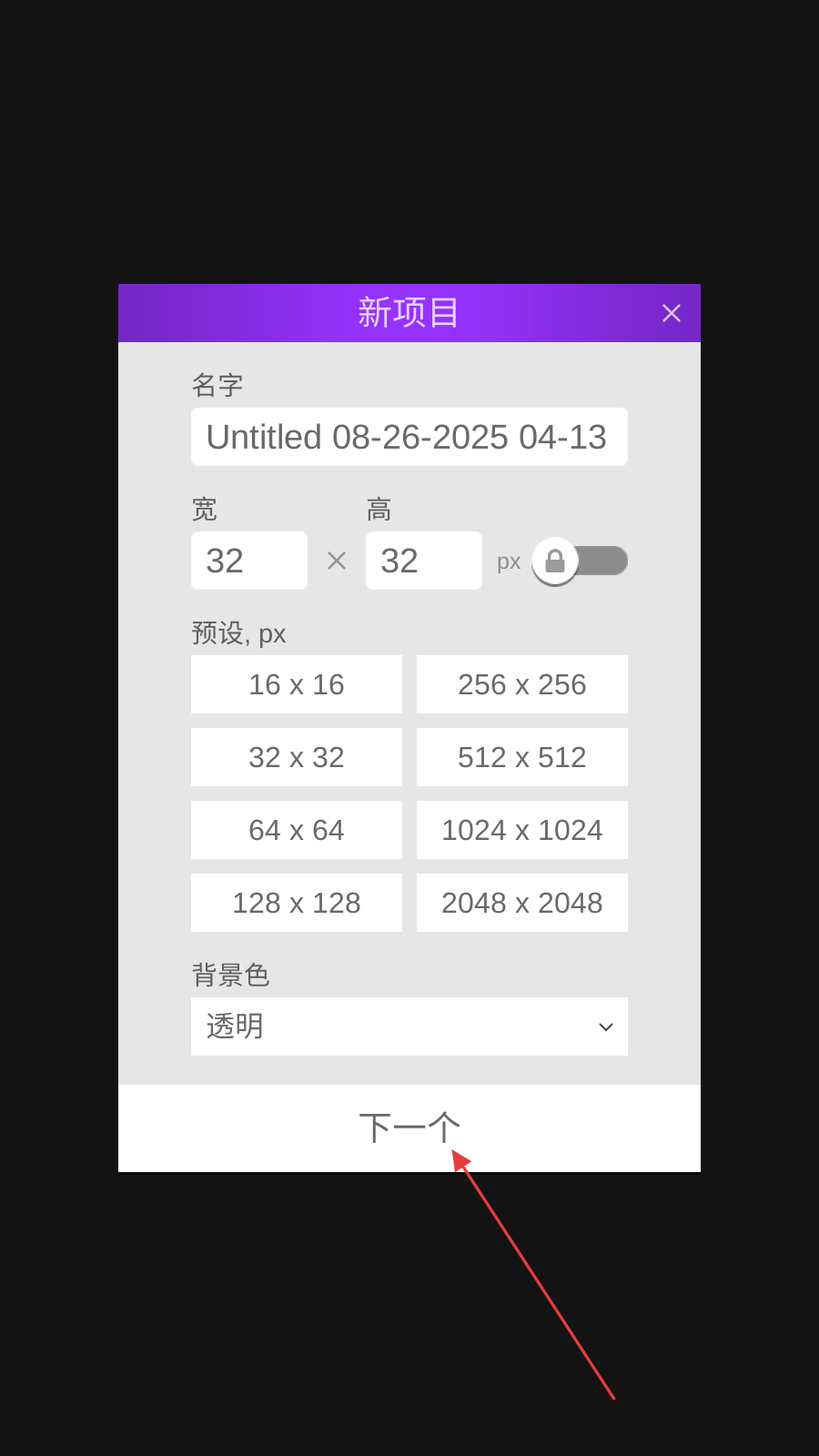 2、在新项目设置页面,可对画布进行相关设置,在名字栏可为画布命名,在背景色选项中选择想要的背景颜色,完成设置后点击下一个。