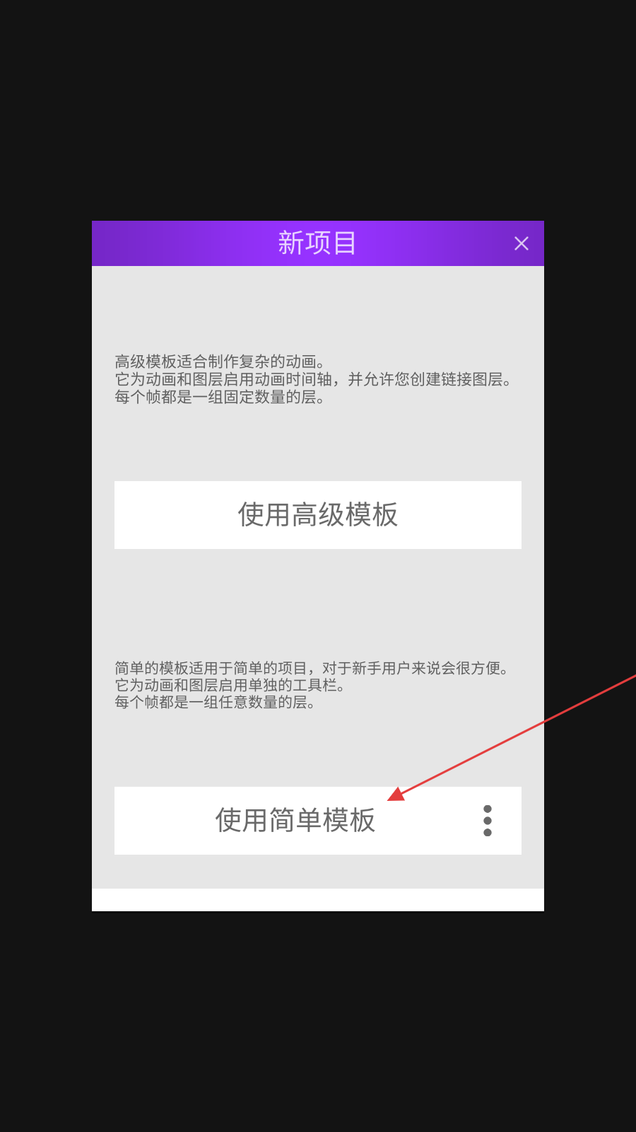 3、随后会出现模板选择界面,若制作复杂动画,可点击使用高级模板,若为简单项目且是新手用户,点击使用简单模板,即可成功新建画布,进入编辑界面开始创作。