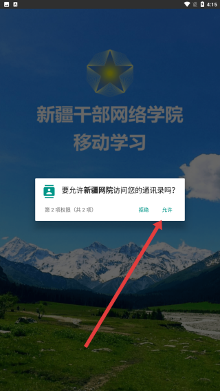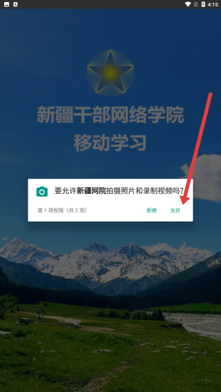 1、新疆干部网络学院APP启动页,点击允许授予拍摄和录制视频权限,推进权限确认流程。
