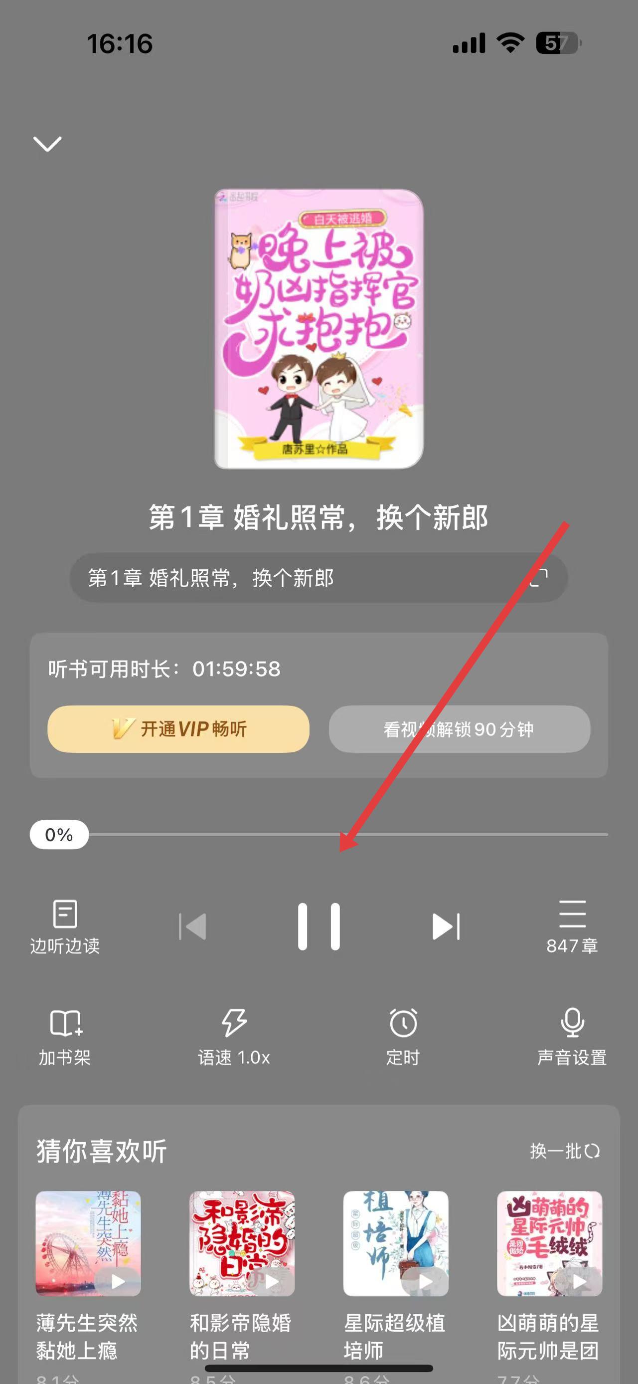 3、进入听书界面,可点击暂停/播放等按钮,控制听书进程。
