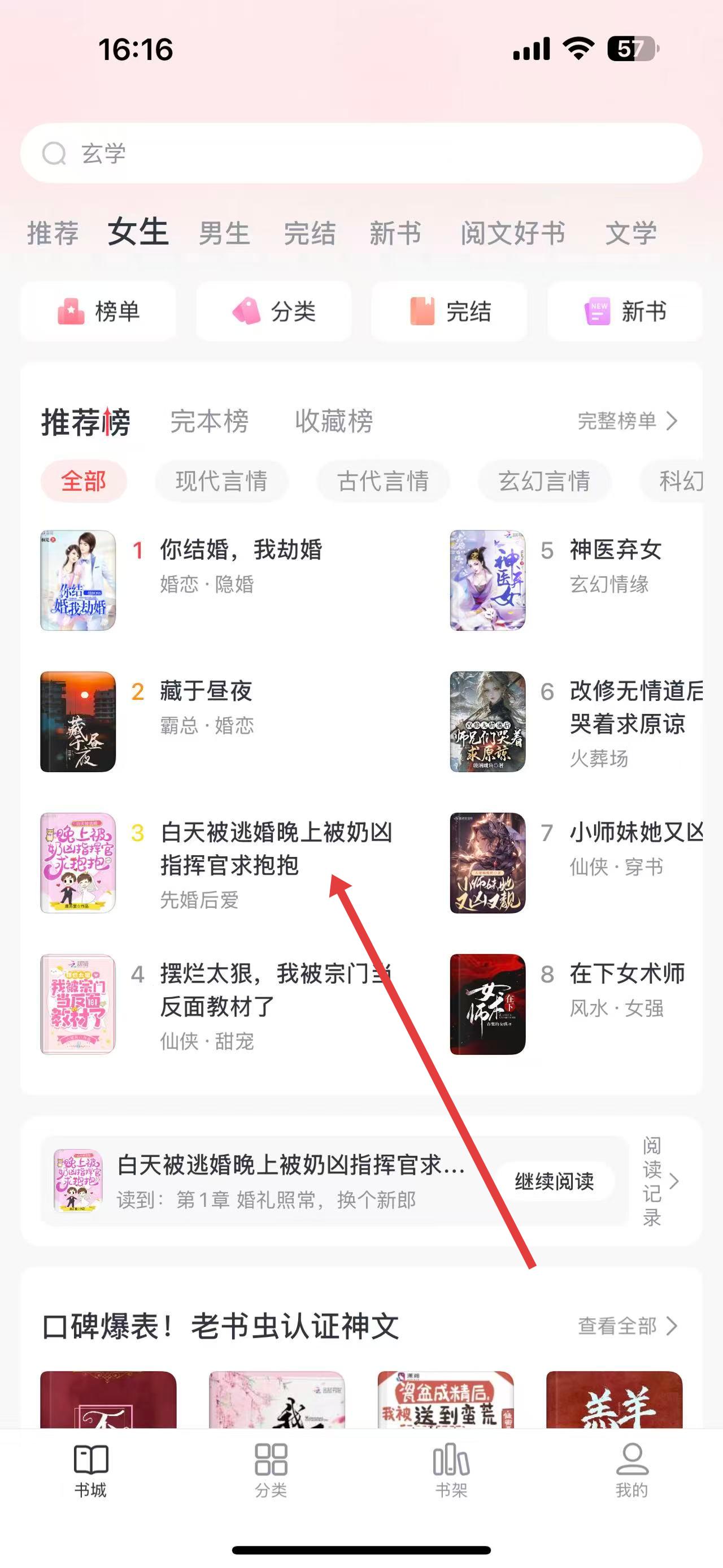 1、打开悦读小说APP进入书城,在女生推荐榜找到白天被逃婚晚上被奶凶指挥官求抱抱小说点击进入。