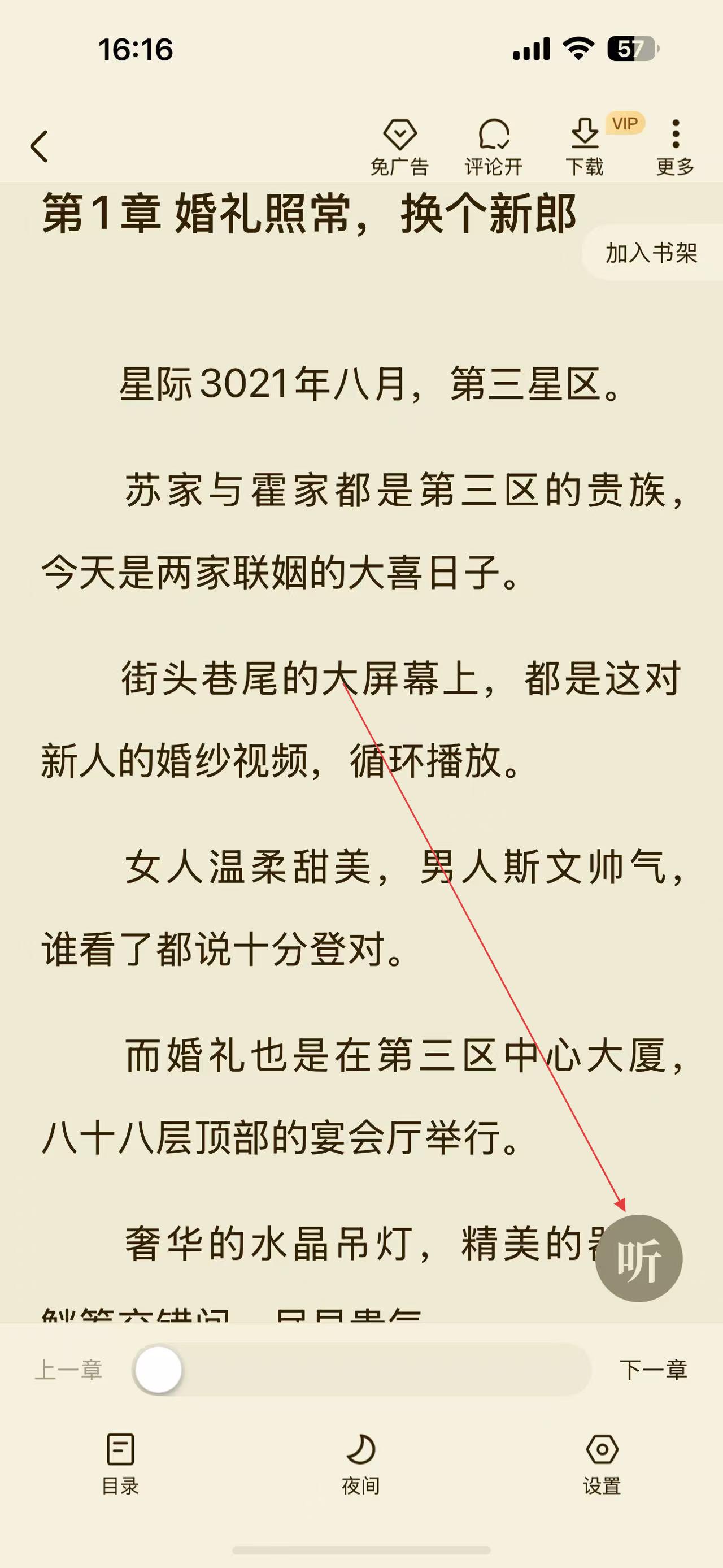 2、在小说阅读界面,点击右侧听按钮,开启听书模式。