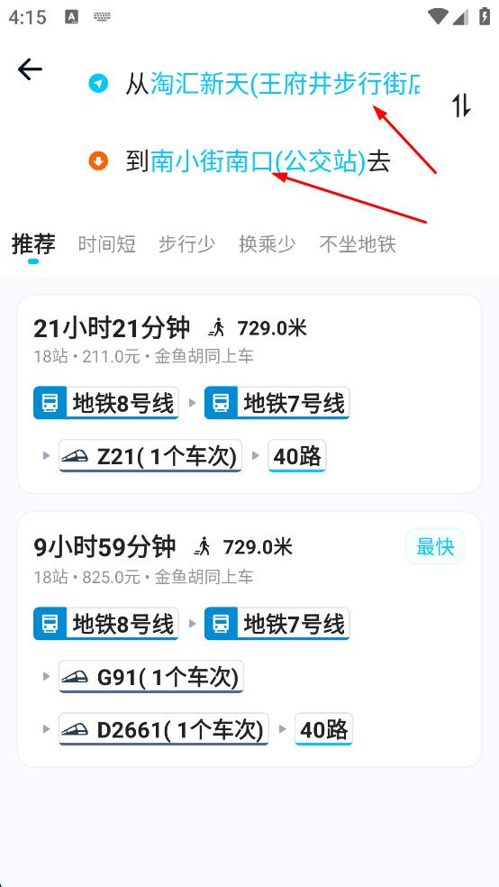 2、确认出发地与目的地后,APP自动生成推荐线路,呈现不同方案,可按需选择时间短、步行少等分类查看。