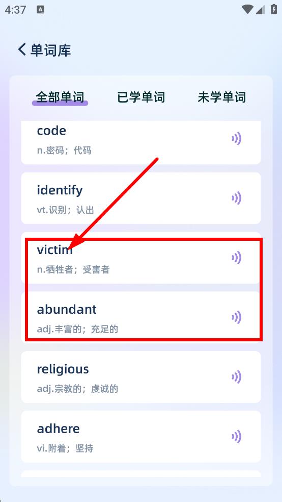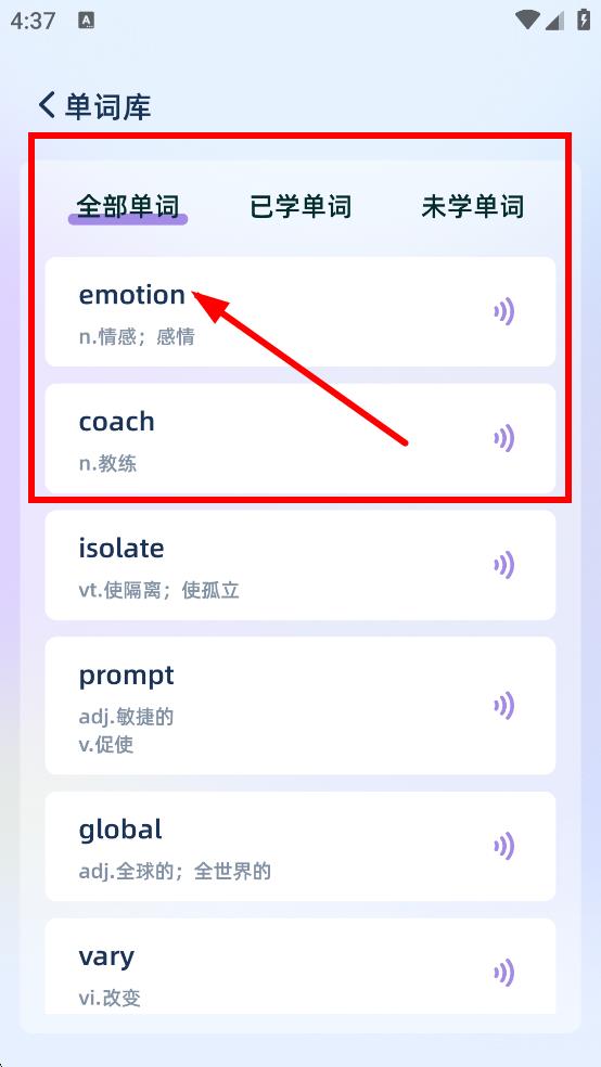 2、在单词库全部单词列表中,可查看单词,还能点击听发音。