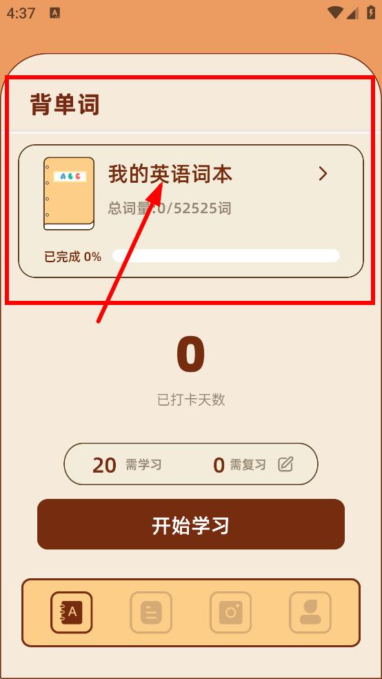 1、在背单词页面,点击我的英语词本,进入单词库页面。